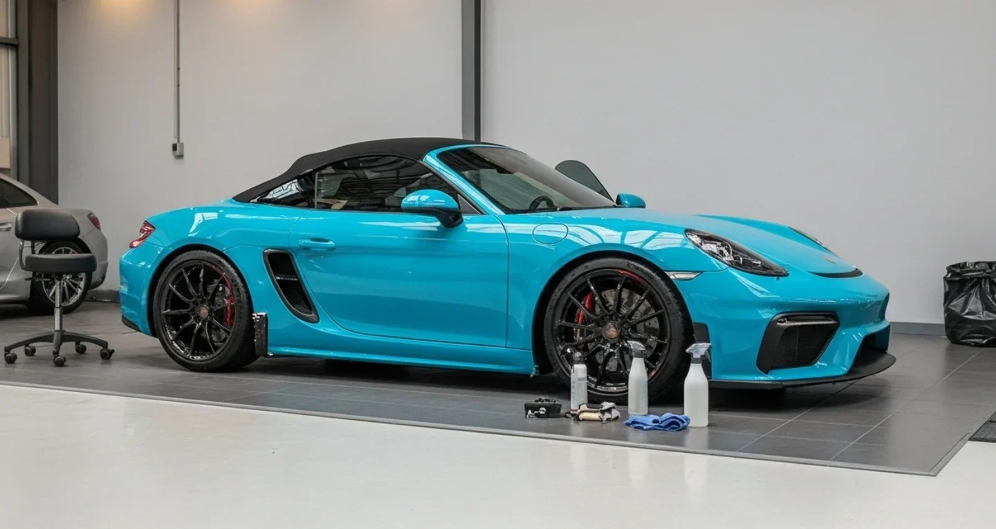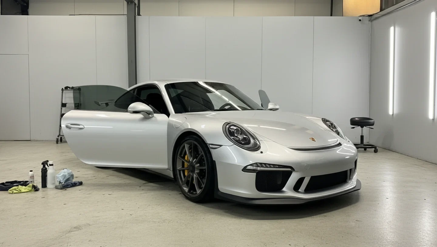 We examine every panel, trim, and windshield for existing imperfections. Then we clay bar, degrease, and prep your Porsche in our clean, dust-controlled bay for optimal bonding and clarity.
